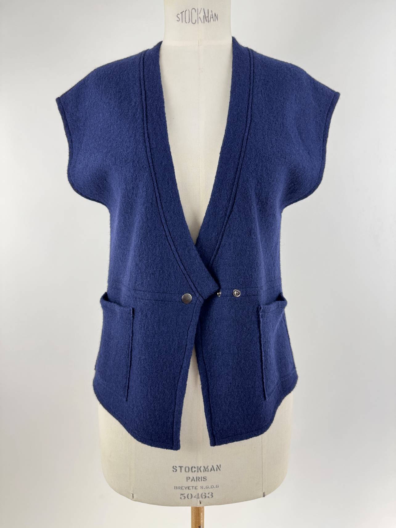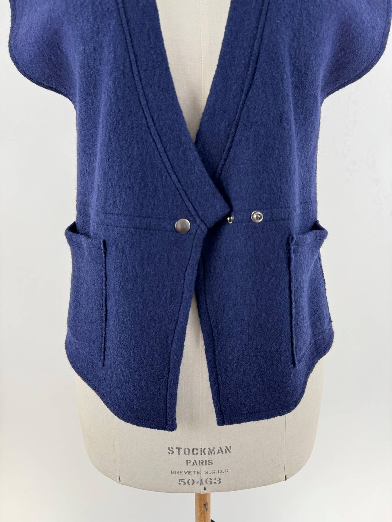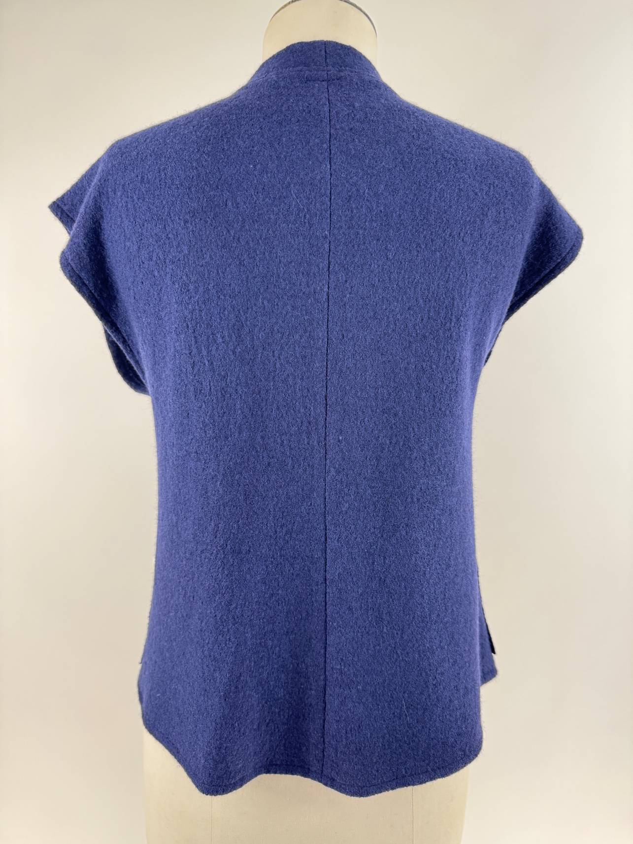 Edi-Louise, pièce unique pour ce gilet dont le corps est réalisé en laine mélangée bleu outremer: