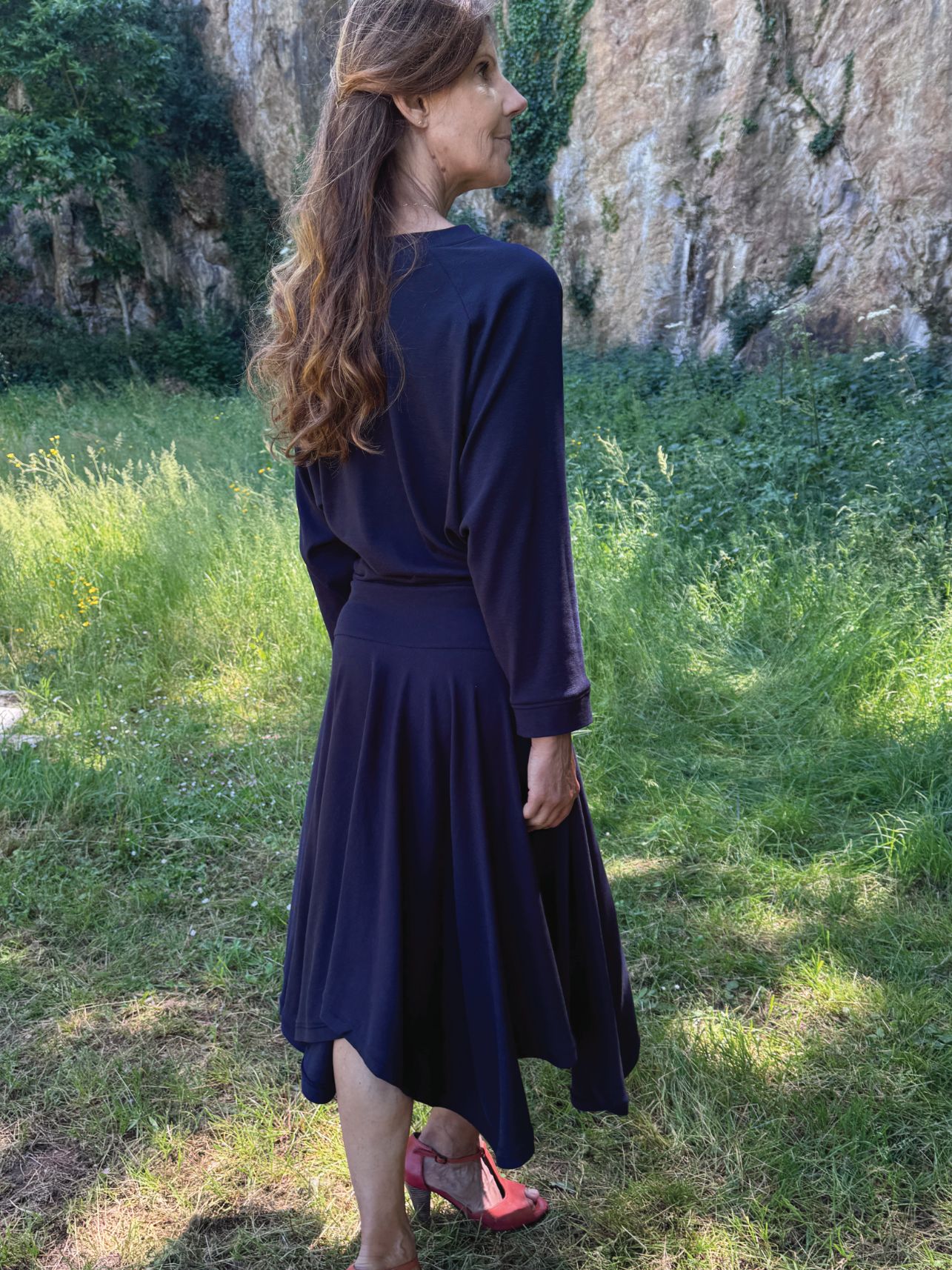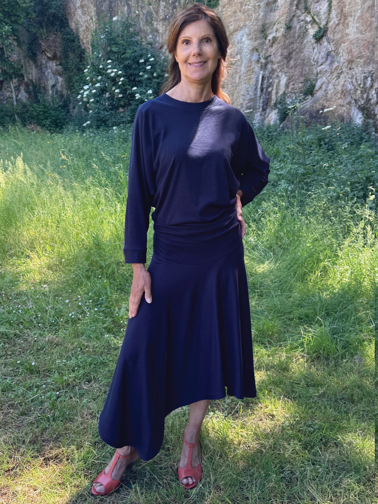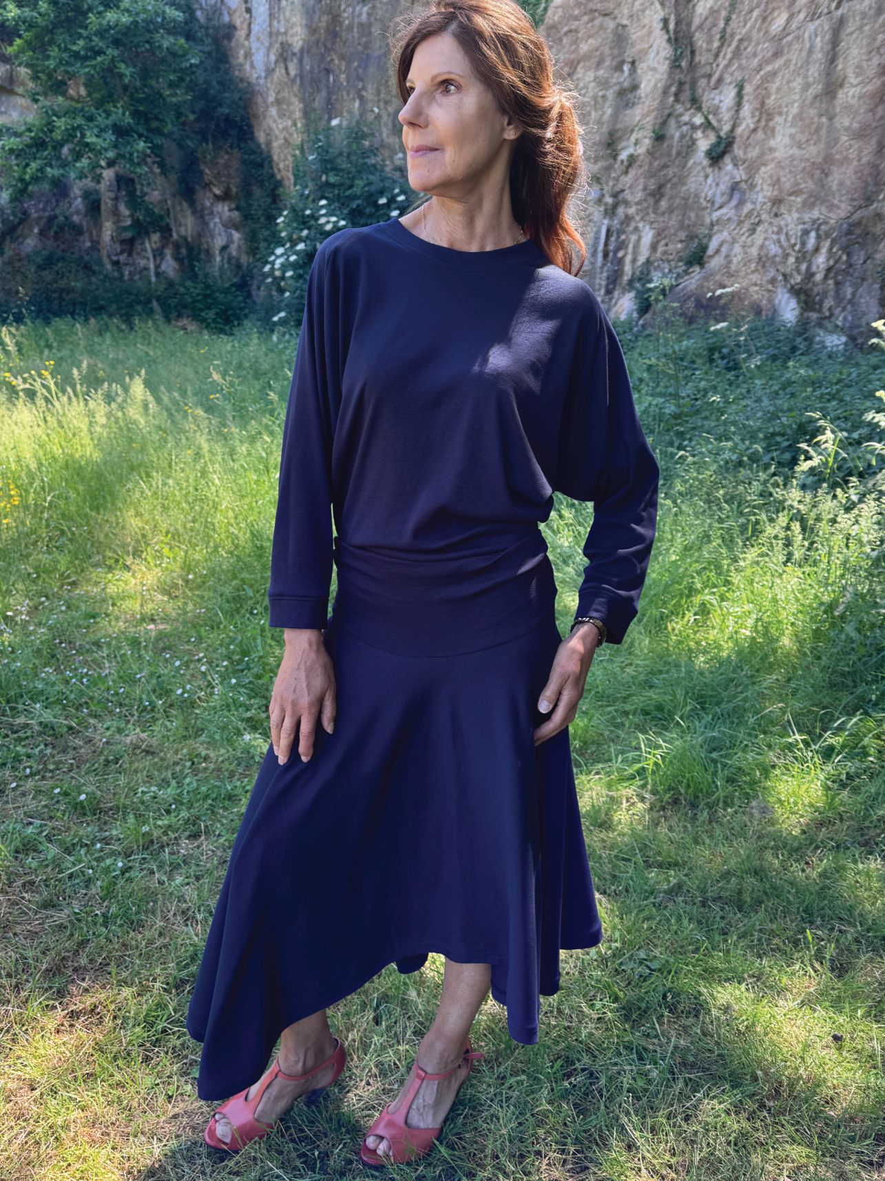 La robe Ginou est la dernière née de la ligne Gina: un haut chauve-souris associé à une jupe sans couture.