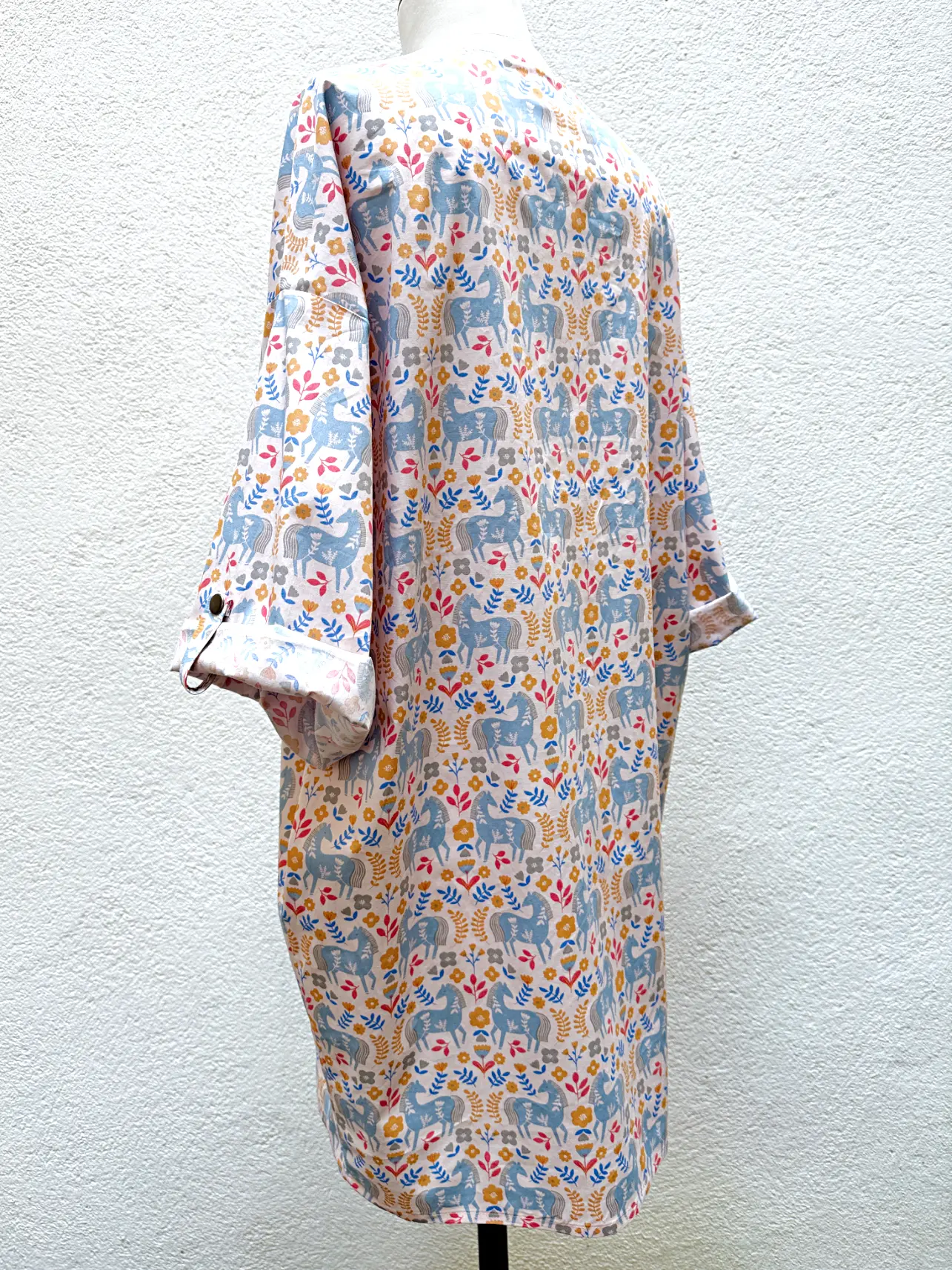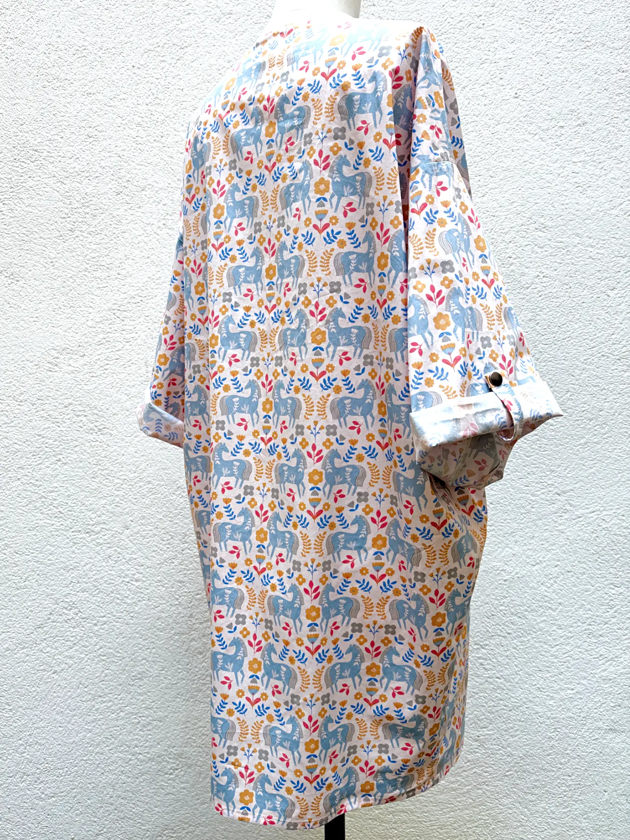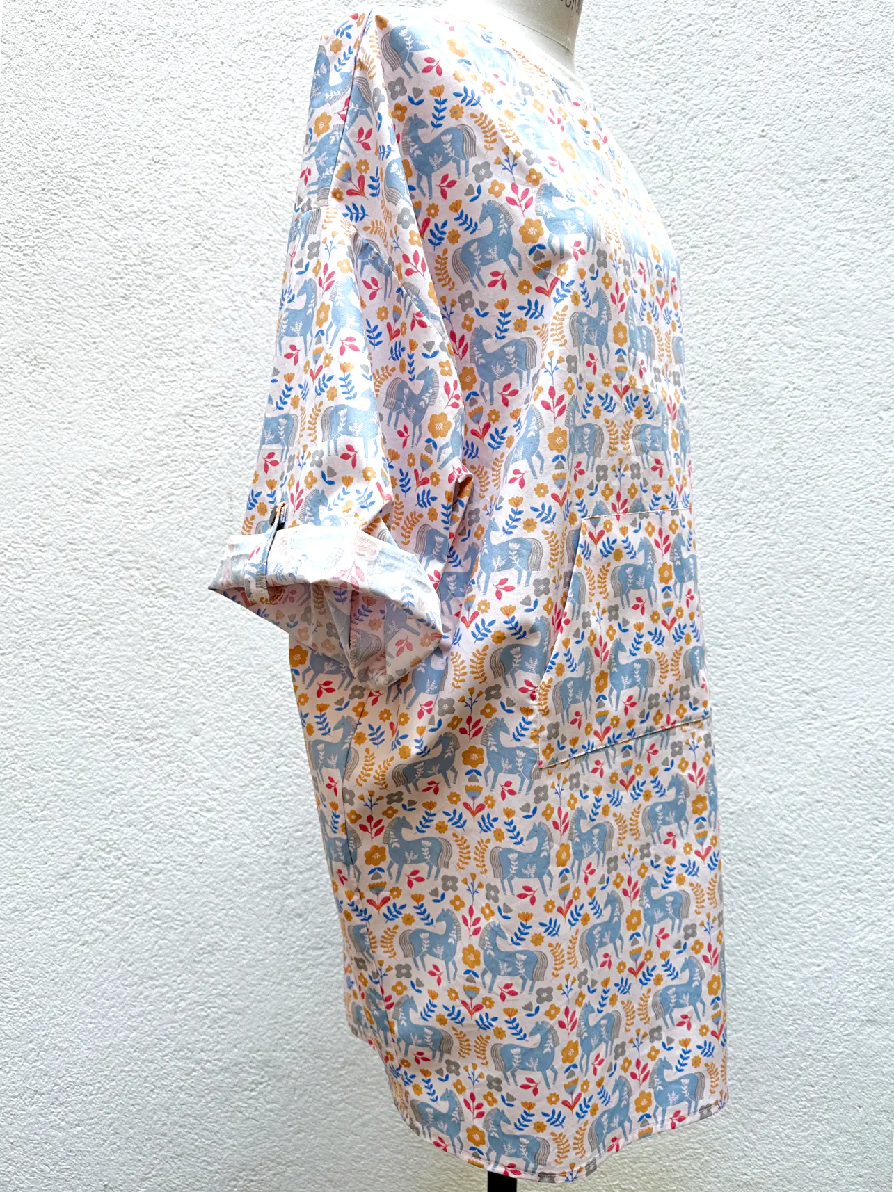 Robe ultra ample Héroïne, proposée exceptionnellement un taille unique, réalisée en popeline de coton au au motif naïf et coloré inspiré du folklore.