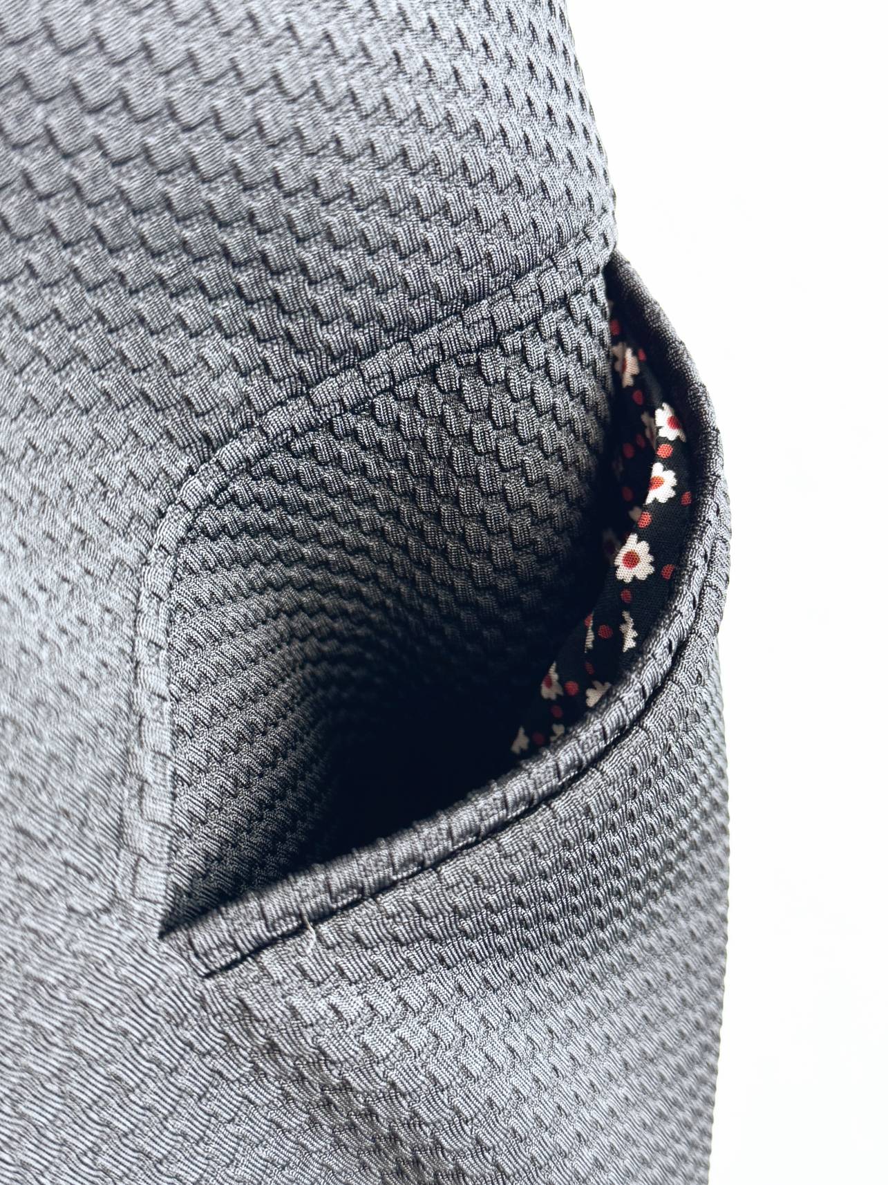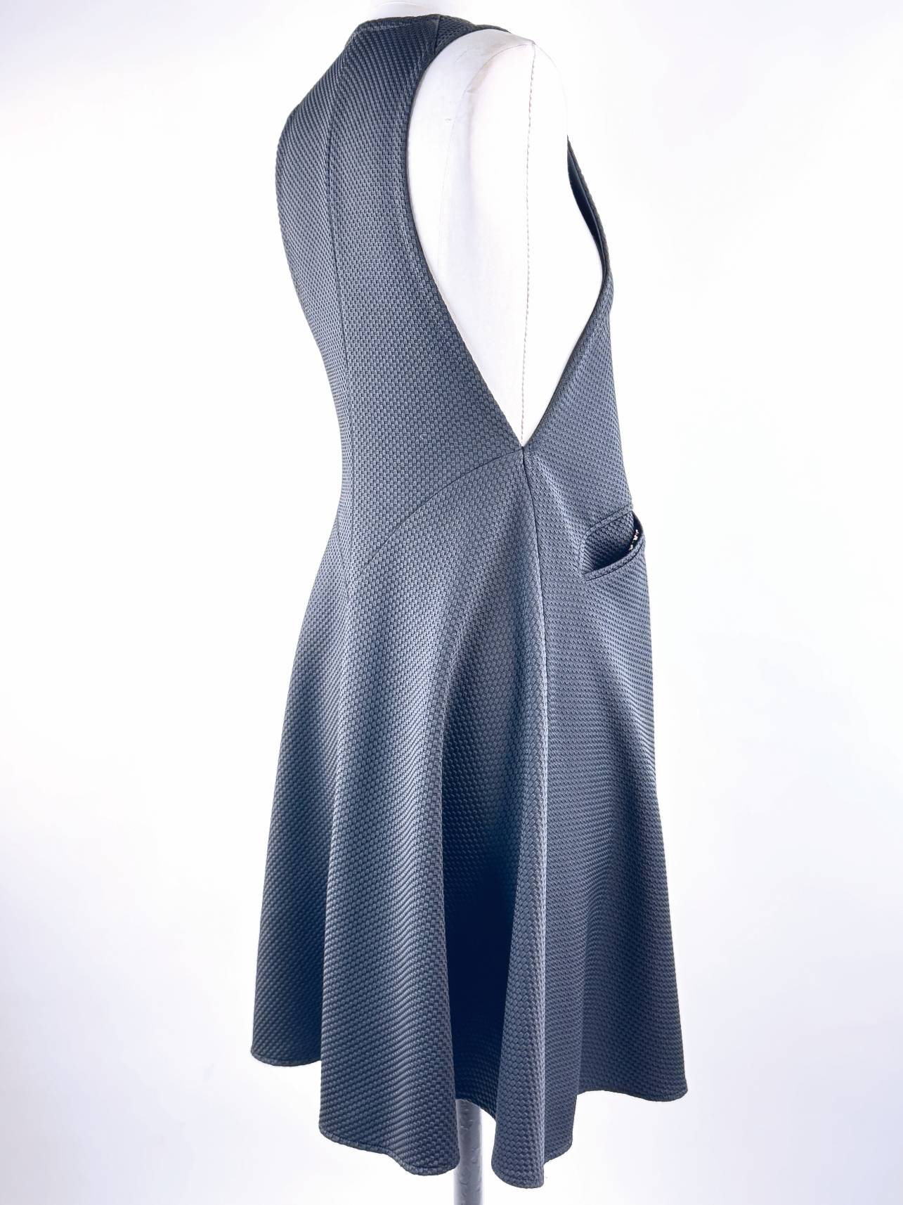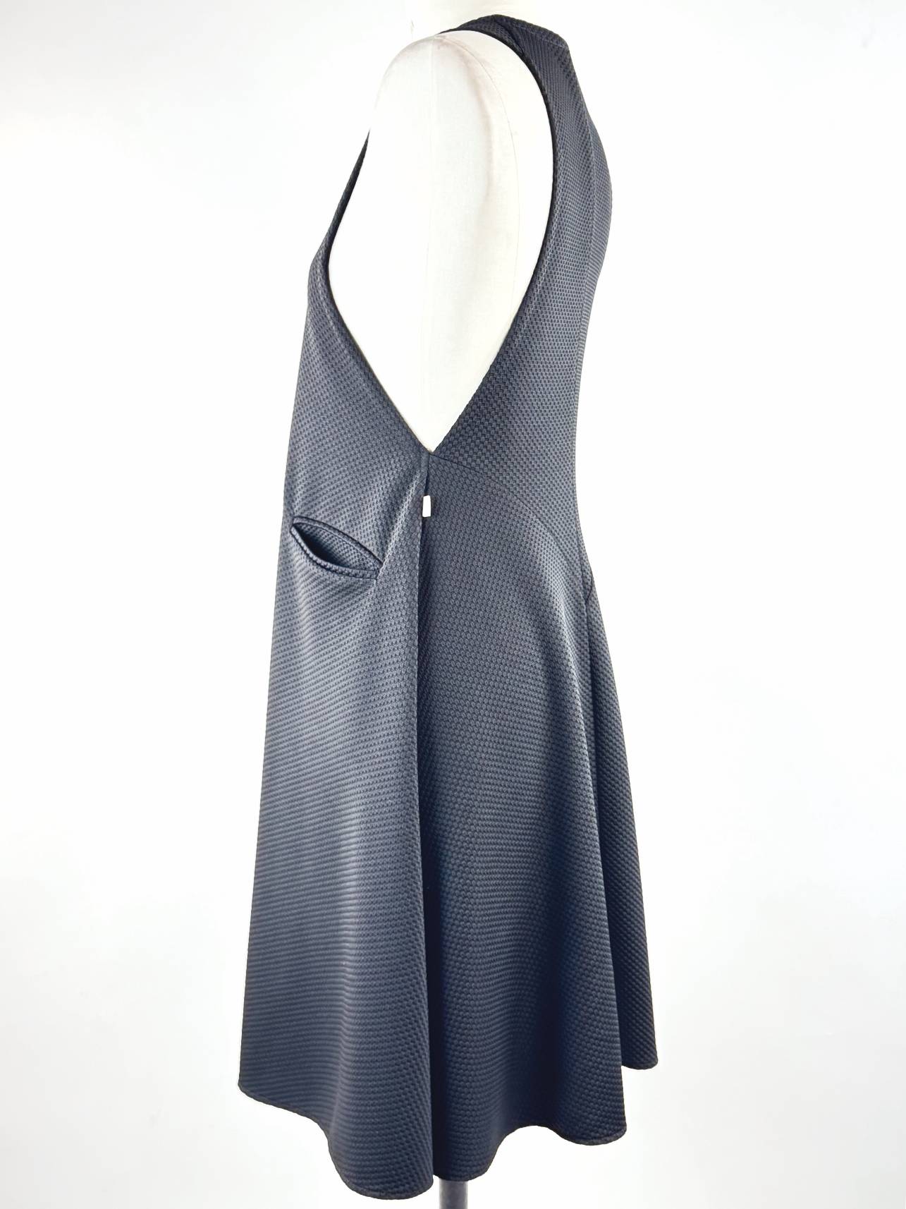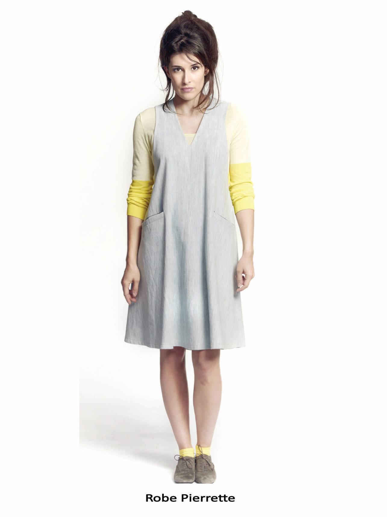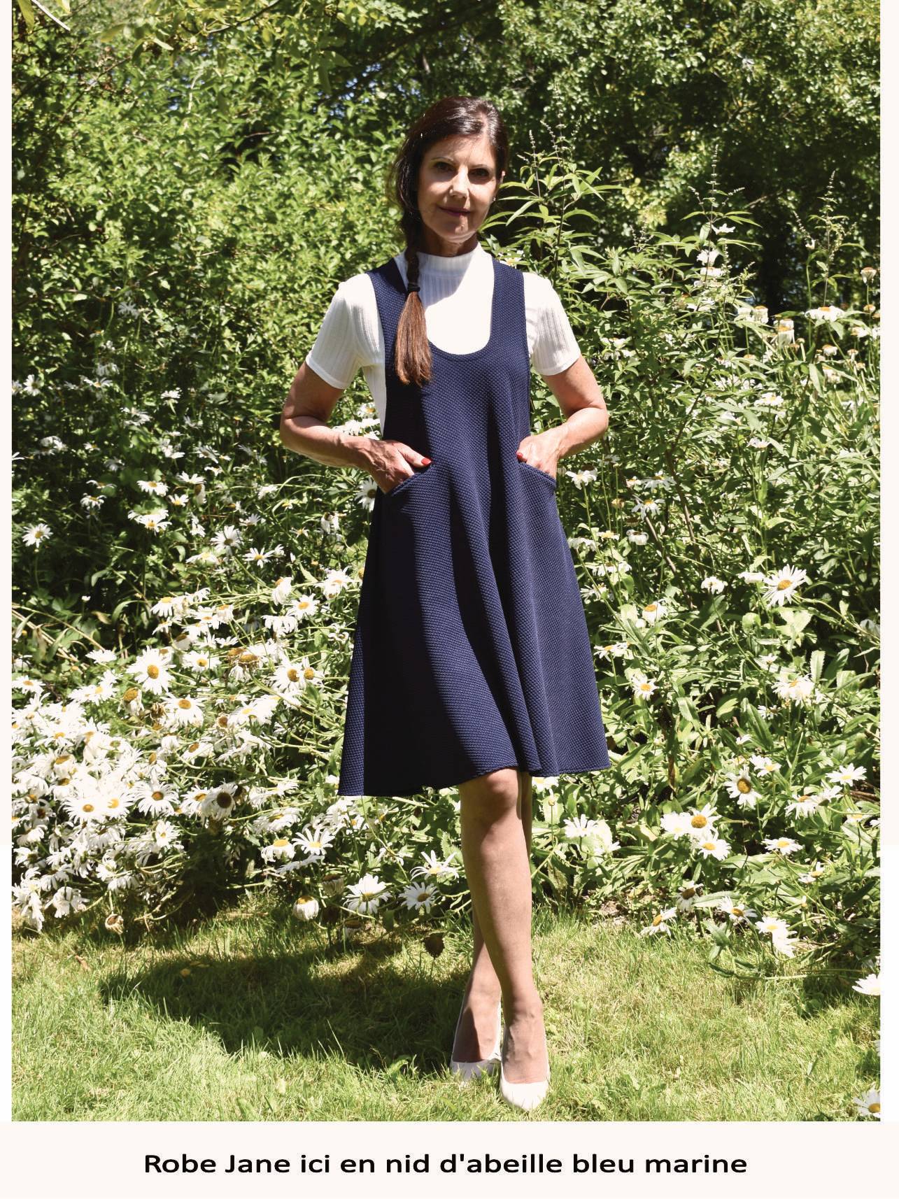 La robe chasuble en nid d’abeille de polyester avec poches passepoilées, coupe et couleur au choix, présentée ici en avant première la robe Joyce, puis tout autre modèle disponible: