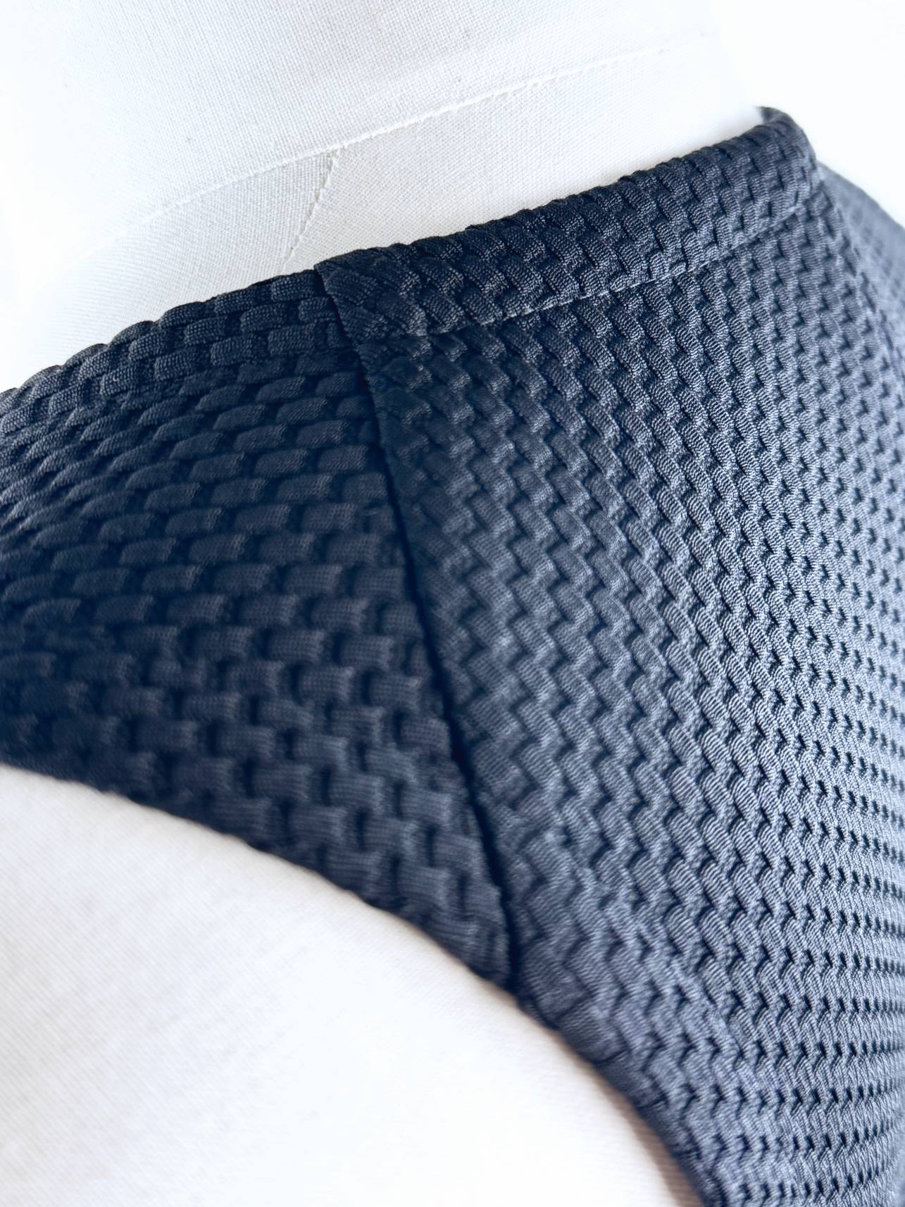 - Biais rabattu surpiqué nervure à l’encolure et aux emmanchures