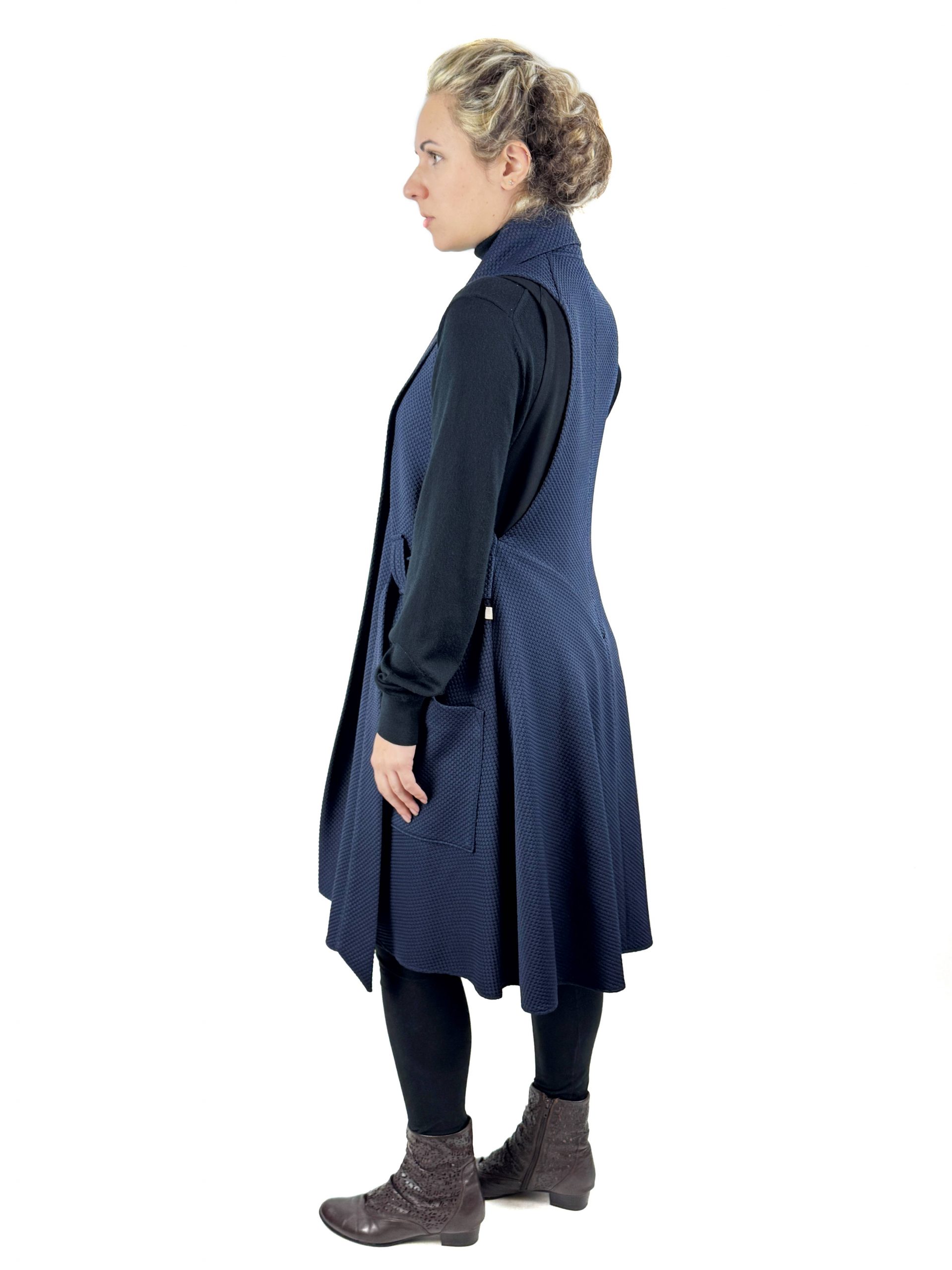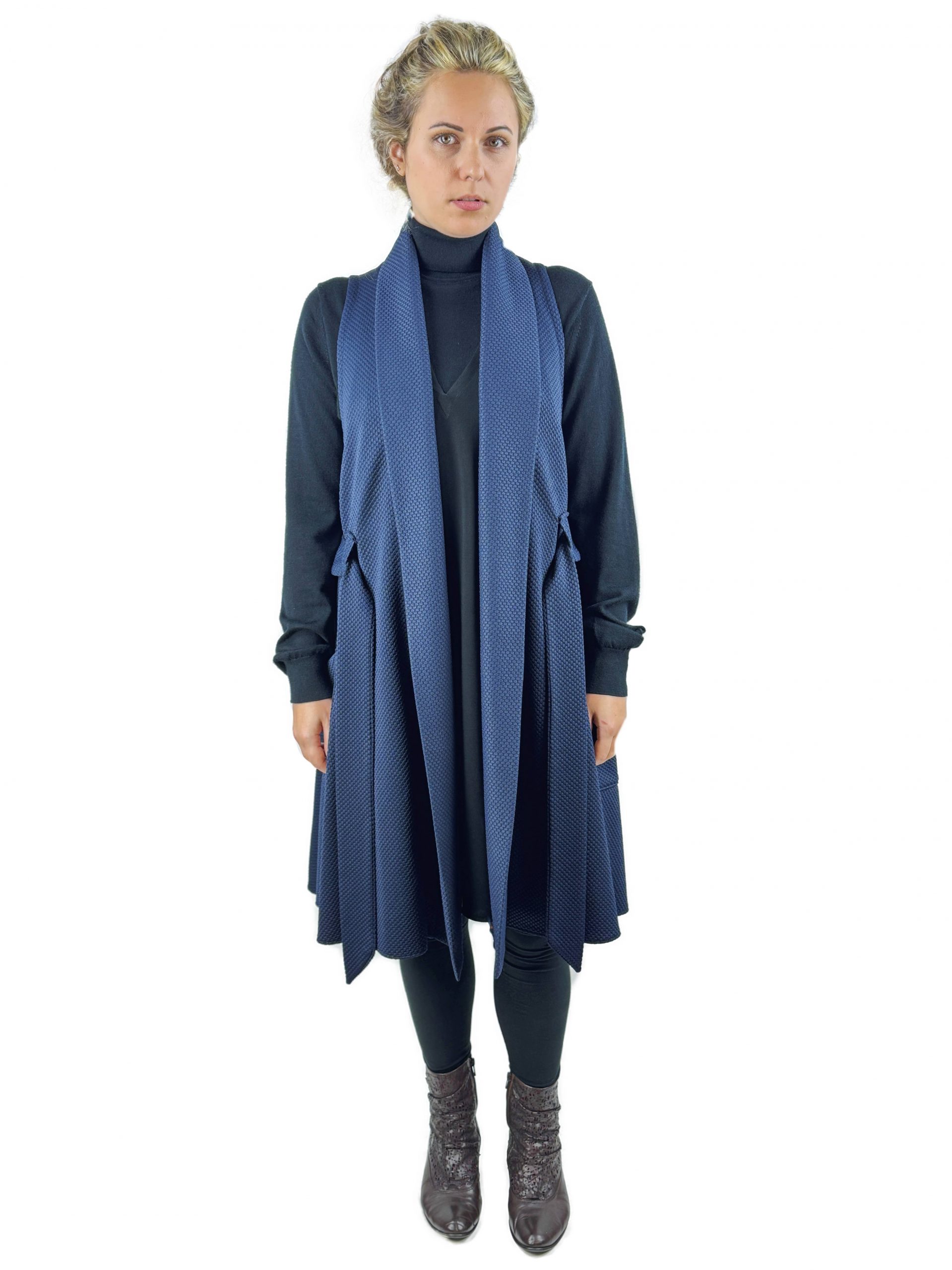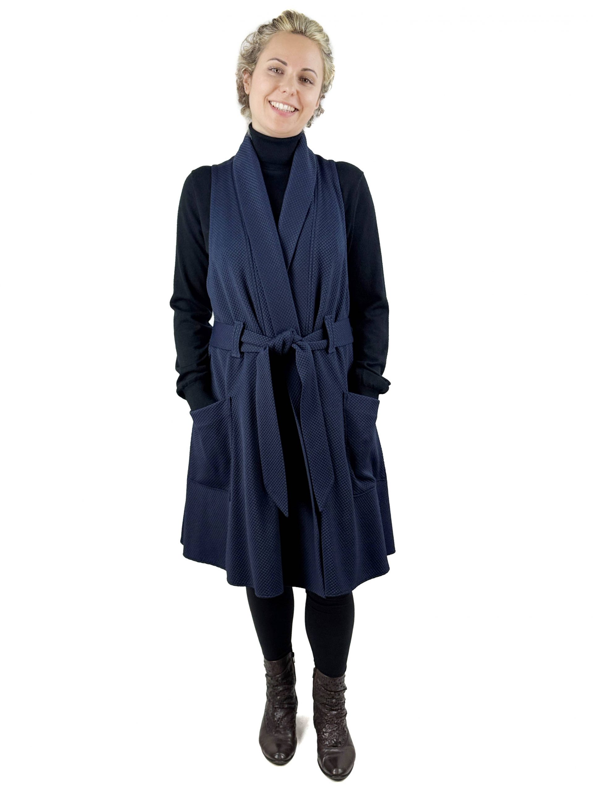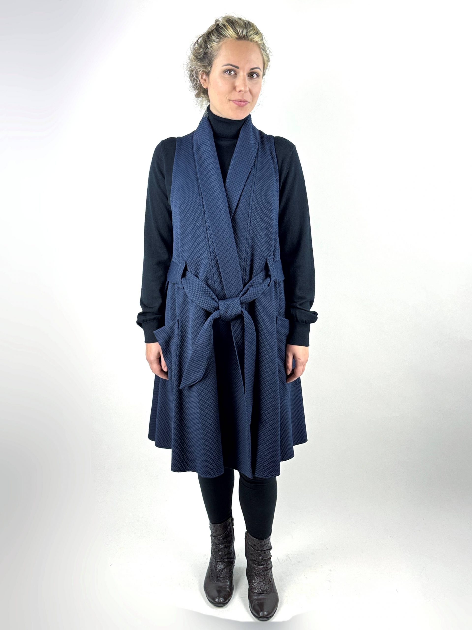 Robe-manteau Jino, réalisée en nid d’abeille bleu marine , au design fluide et sculptural. Poches oversize et chasuble pour une allure à la fois chic et audacieuse: