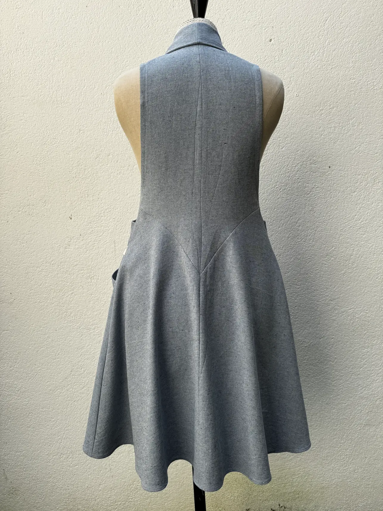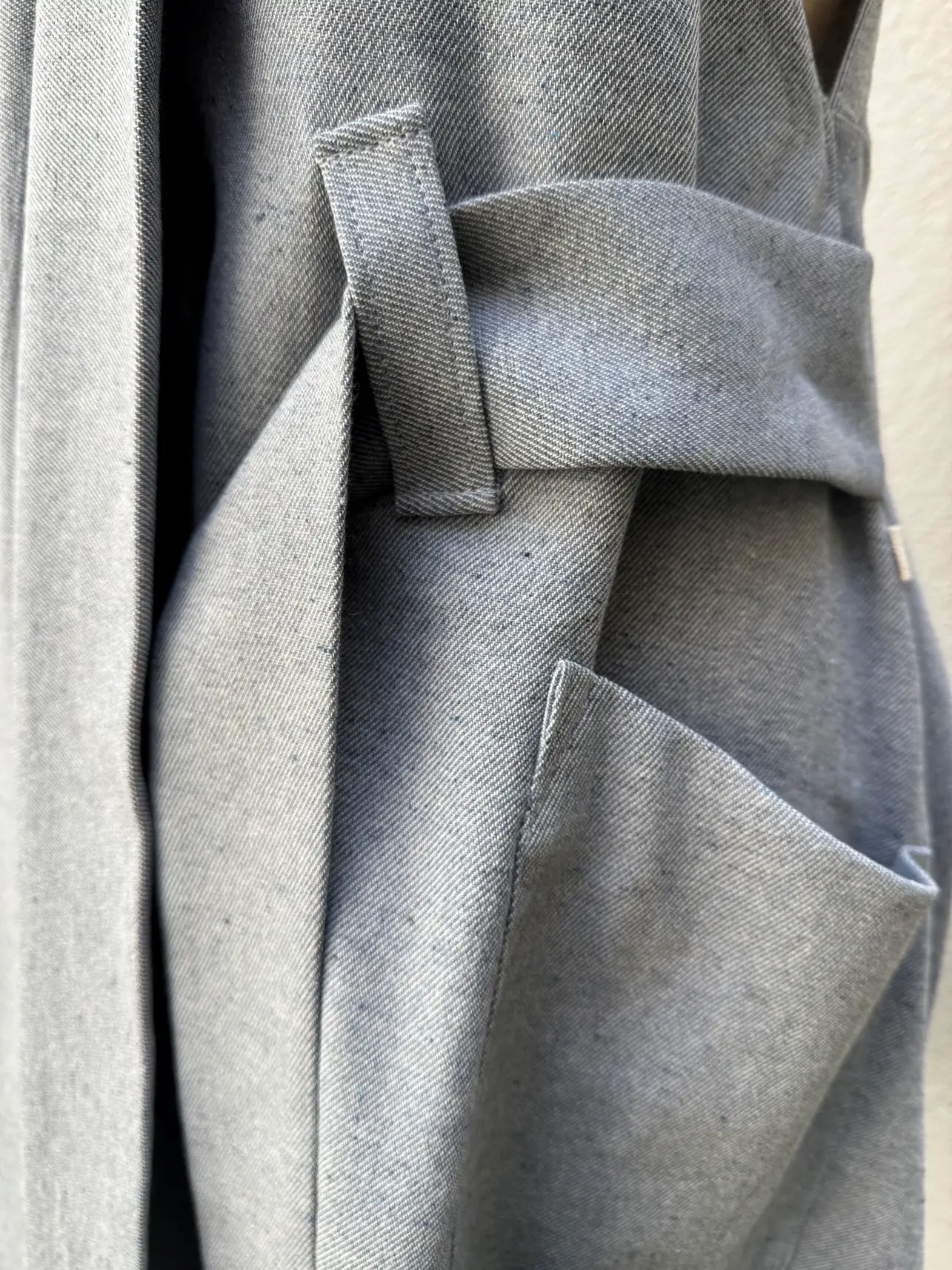 Robe-manteau Jino, réalisé en jean recyclé et en pièce unique, au design fluide et sculptural. Poches oversize et chasuble pour une allure à la fois chic et audacieuse: