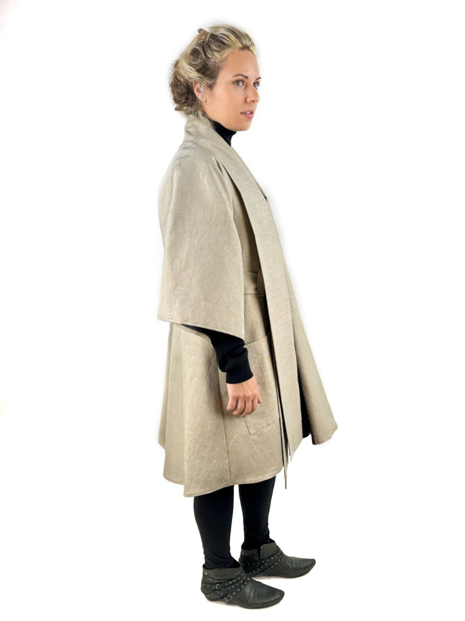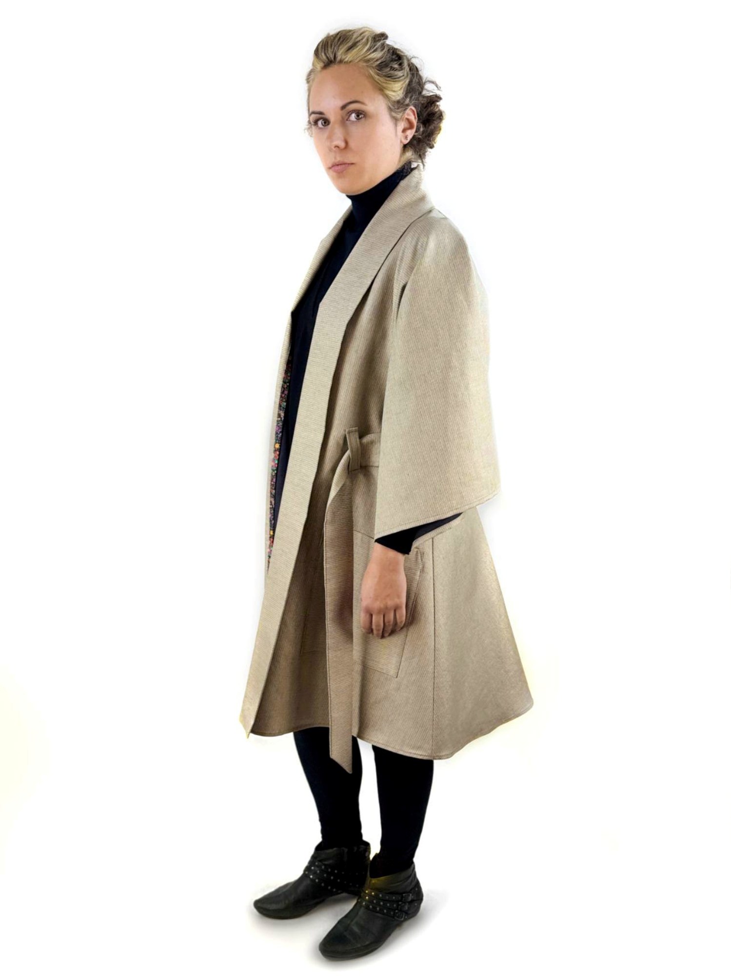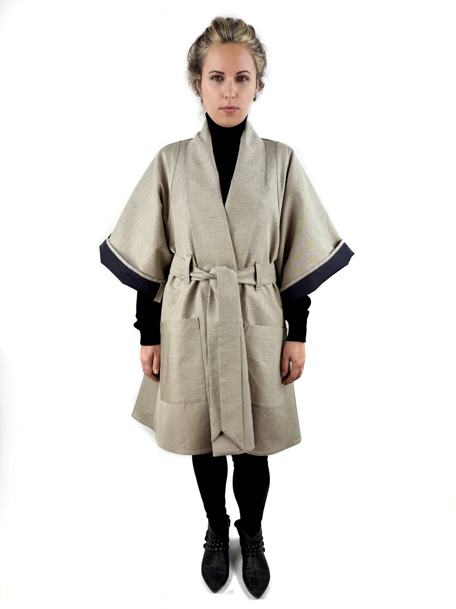 Sa coupe droite et fluide est soulignée par de larges manches trois-quarts, une ceinture à nouer qui permet d’ajuster la silhouette, et de grandes poches plaquées qui ajoutent une touche pratique et contemporaine. Portée ouverte comme un manteau léger ou fermée comme une robe, Primevert s’adapte aux saisons et aux envies.