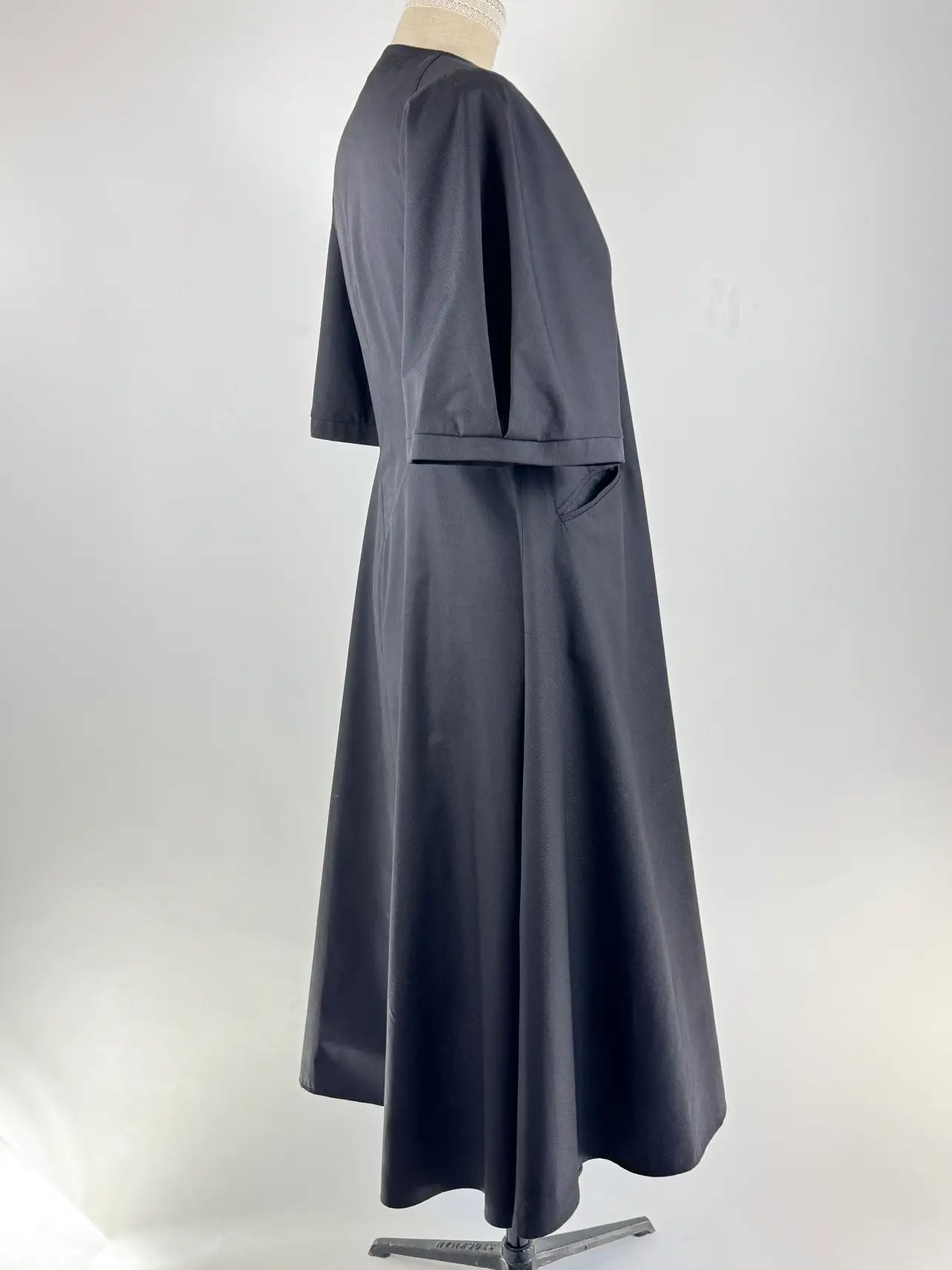 La robe Plaisir, pièce unique réalisée dans un jacquard de coton noir, à l’emmanchée plissée réalisée sur une base chasuble, qui permet les juxtapositions: