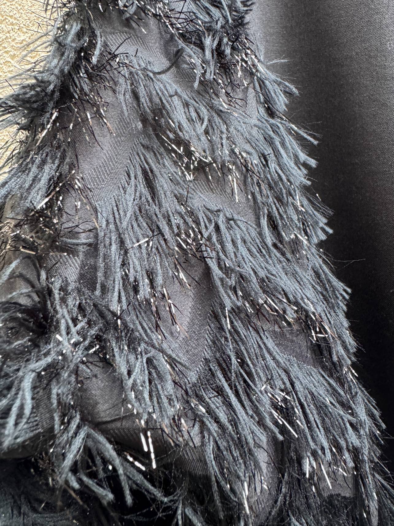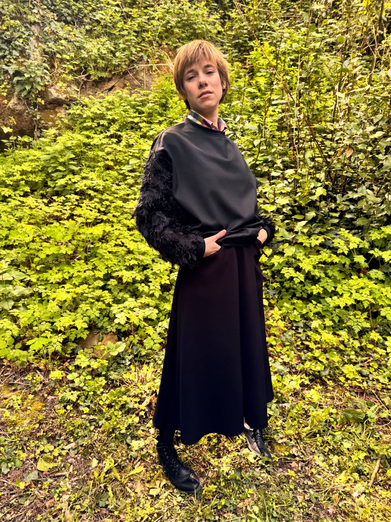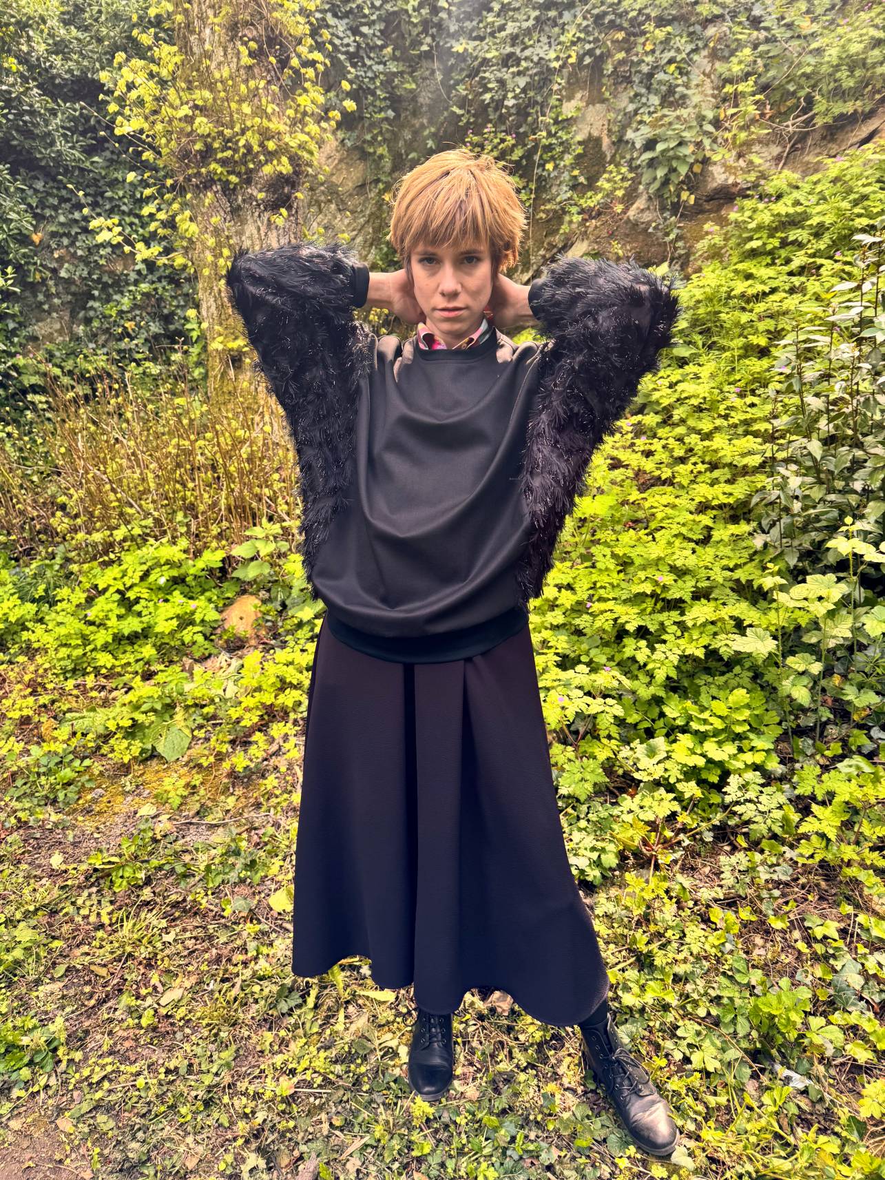 Pièce unique pour ce sweat entièrement coupé aux ciseaux, élément par élément, en levant le « poil » de l’organza, le corps est réalisé dans un drap de laine: